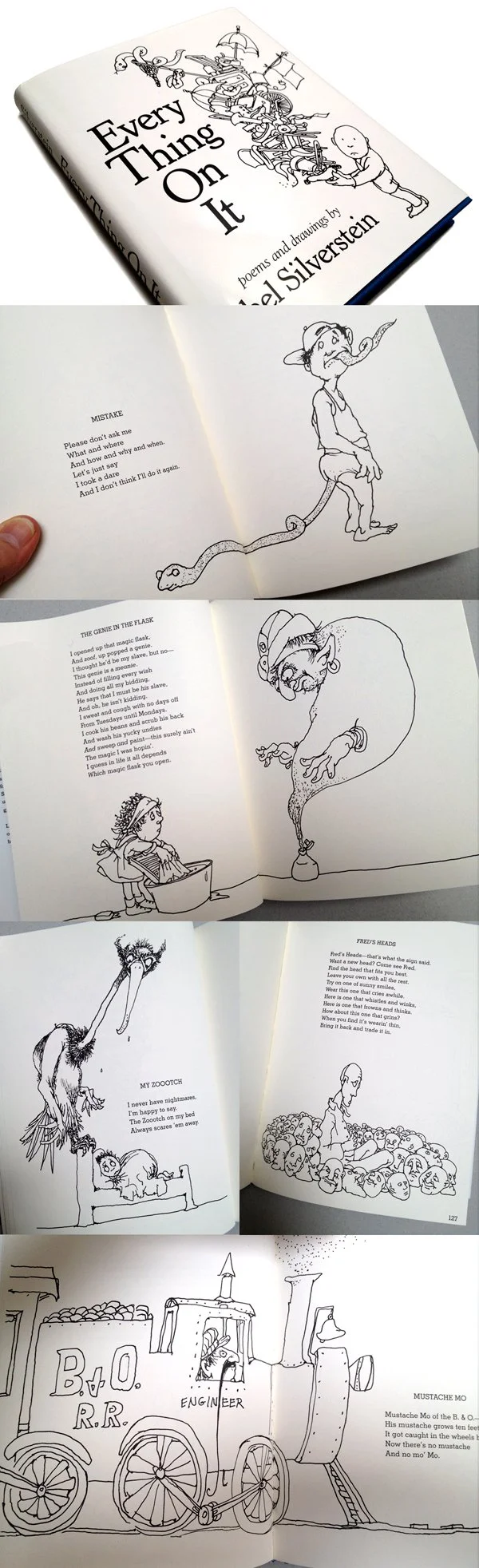 Twelve years after Shel Silverstein’s passing, a book of more than one hundred and thirty never-before-seen poems and drawings is published to remind of his genius. We do know that Every Thing On It was compiled by the family and the folks at Harper Collins, but we don’t know exactly how. I can only speculate that if they found this many works that hold together so well, the pool must be big and deep. Both his words and his lines take your mind into absurd and magical places with aplomb. Though his line appears so effortless and loose, his control captures the human condition with the slightest of downturn in a lip or placement of his beady eyes. His characters are every bit as surprised and dismayed at the situations in which they find themselves as we are to see them. Imagine the mistake of daring to swallow a snake or the scene about to unfold when Mustache Mo gets his mustache caught in his train’s wheels. Silverstein walks the fine line of disturbing and just a little devilish. Once you get the fever, you can’t wait to turn the page to see what he has dared you to look at and read—and you do for 200 pages. It’s inspiring, humorous, poignant, cynical, snotty and sweet. It’s just like the title—every thing on it.