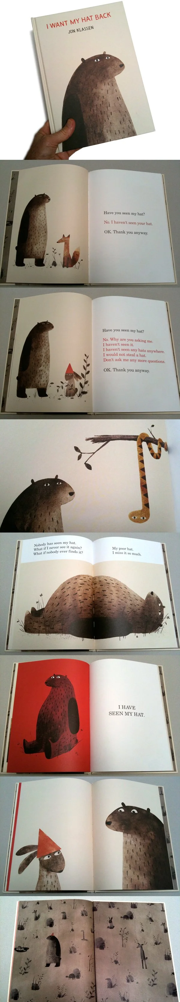 I Want My Hat Back is a breath of fresh air—understated and exquisite in its illustration, story, typography, and design. This is Jon Klassen’s first book that he has penned and a charming tale he has told. It is a deceptively formulaic search the bear takes on to find his hat. So used to the answer ‘no’, he misses the solution when it’s under his nose. Several tiny exchanges between shifty-eyed creatures lend additional warmth to the storyline. The illustrations are graphic with the subtlest rendering and coloration. Large silhouettes are contrasted with delicate foliage beneath softening each page and creating the environs. The illustrations are just masterful in all ways. Uncoated paper, big Century Schoolbook font, muted palette, command of scale and surprise—all remind me of a classic Leo Lionni book. The end sheets are sublime. Oh, the moral of the story—thievery is punishable!